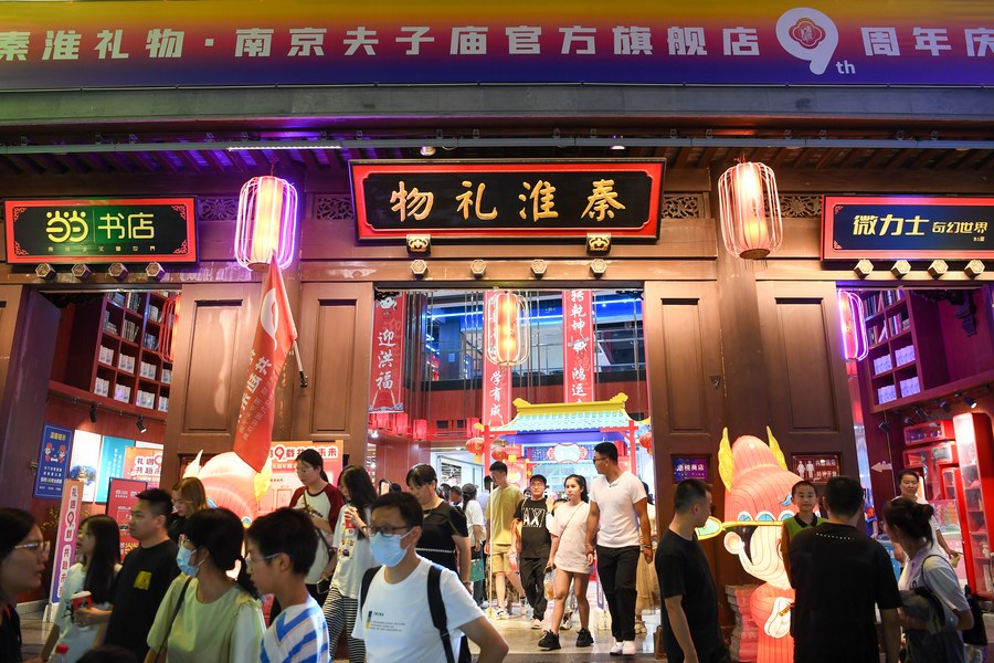 Tourists select souvenirs at a gift shop at the Fuzi (Confucius) Temple scenic area in Nanjing, east China's Jiangsu Province, Aug. 18, 2023. (Xinhua/Li Bo)