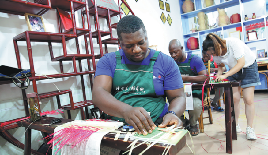 Students from Guinea attend a workshop on bamboo weaving organized by the International Bamboo and Rattan Organization in Meishan, Sichuan province, on Tuesday. YAO YONGLIANG/CHINA NEWS SERVICE
