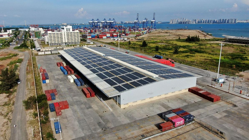 Photo shows solar panels on top of warehouses at Yangpu Port in south China's Hainan Province. (People's Daily Online/Fu Wuping)