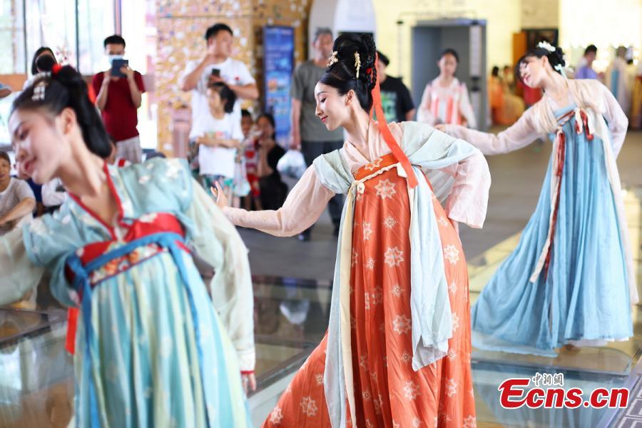 Artists in traditional Chinese costumes dance to present folk customs of Qixi Festival in a museum at the Grand Baoen Temple Heritage and Scenic Area in Nanjing, east China's Jiangsu Province, Aug. 22, 2023. (Photo: China News Service/Yang Bo)