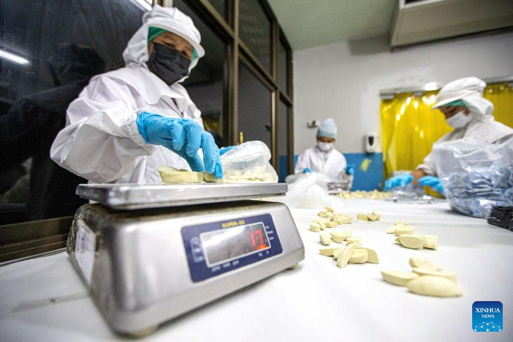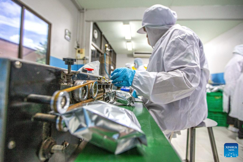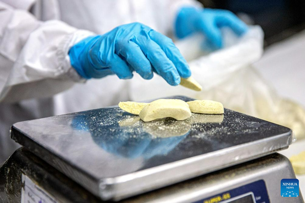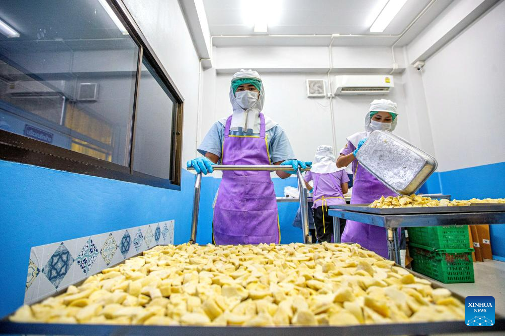 A staff member checks freeze-dried durian products at a fruit products company in Chanthaburi Province, Thailand, Aug. 17, 2023. (Xinhua/Wang Teng)