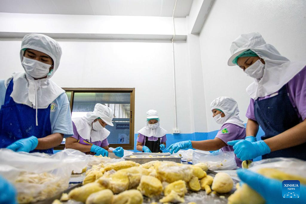 Staff members cut durian pulps at a fruit products company in Chanthaburi Province, Thailand, Aug. 17, 2023. (Xinhua/Wang Teng)