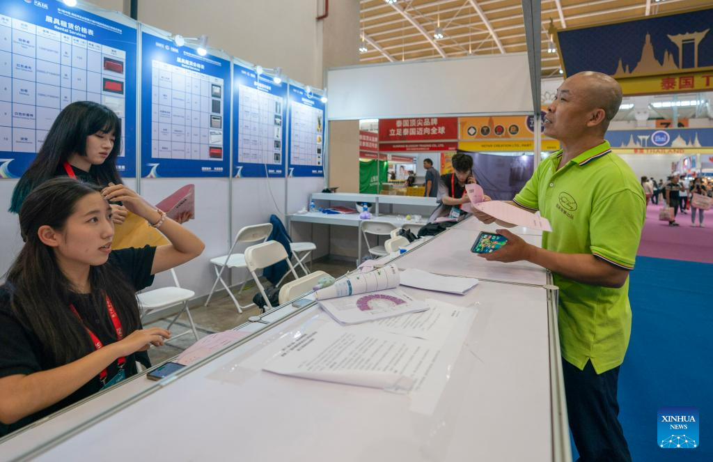 This photo taken on Aug. 18, 2023 shows Chen Jie picking up delivery documents at the service desk in Kunming Dianchi International Convention and Exhibition Center, the venue for the seventh China-South Asia Expo in Kunming, southwest China's Yunnan Province. (Xinhua/Chen Xinbo)