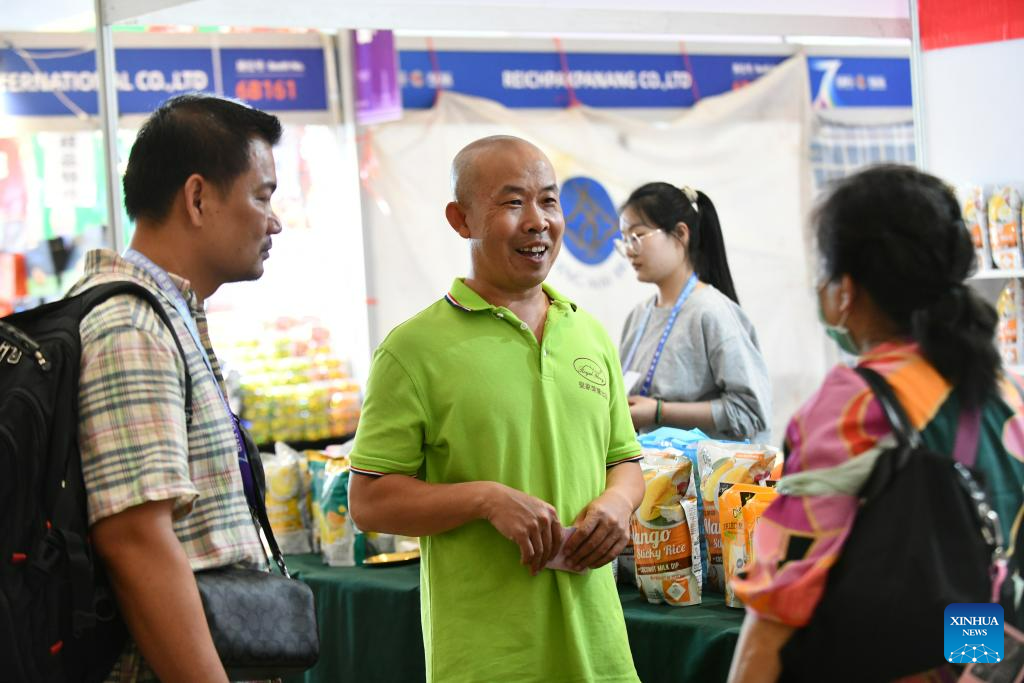 This photo taken on Aug. 17, 2023 shows Chen Jie (3rd R) promoting his freeze-dried durian products at his exhibition booth in Kunming Dianchi International Convention and Exhibition Center, the venue for the seventh China-South Asia Expo in Kunming, southwest China's Yunnan Province. (Xinhua/Hu Chao)