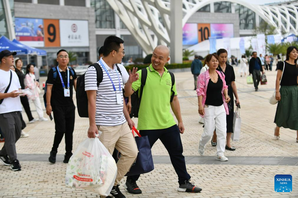 This photo taken on Aug. 18, 2023 shows Chen Jie (in the green shirt) walking out of Kunming Dianchi International Convention and Exhibition Center, the venue for the seventh China-South Asia Expo in Kunming, southwest China's Yunnan Province. (Xinhua/Chen Xinbo)