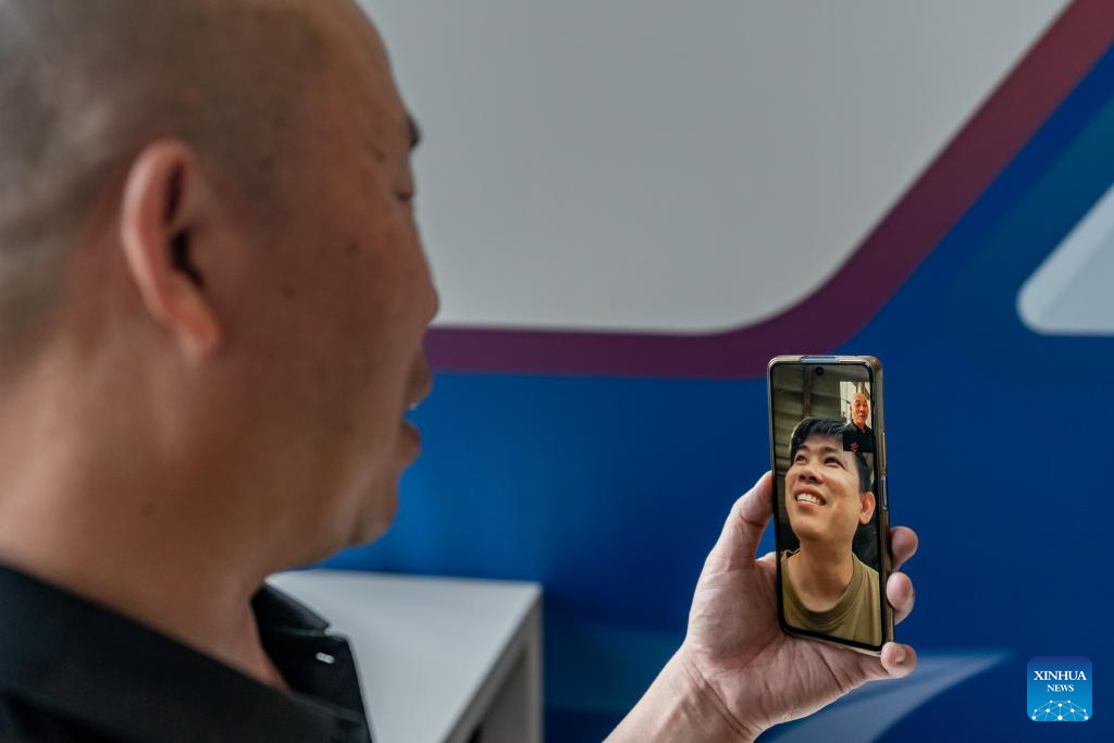 This photo taken on Aug. 20, 2023 shows Chen Jie having a video call with his company's manager in Thailand after the seventh China-South Asia Expo closed in Kunming, southwest China's Yunnan Province. (Xinhua/Hu Chao)