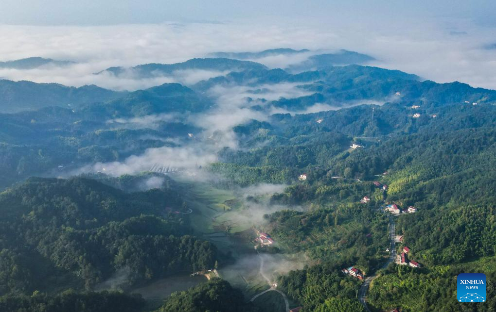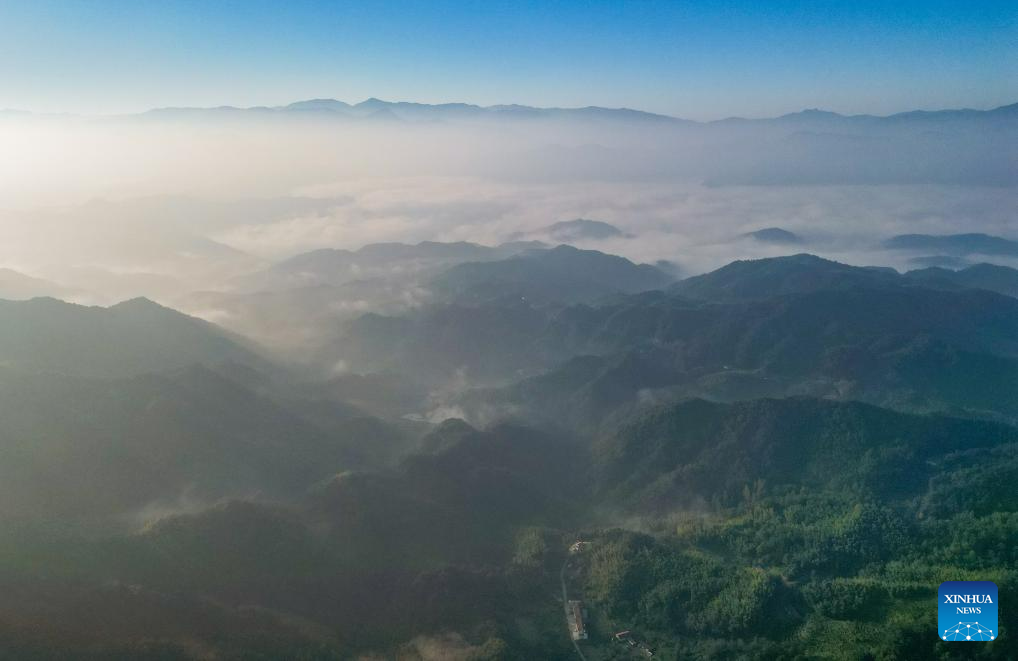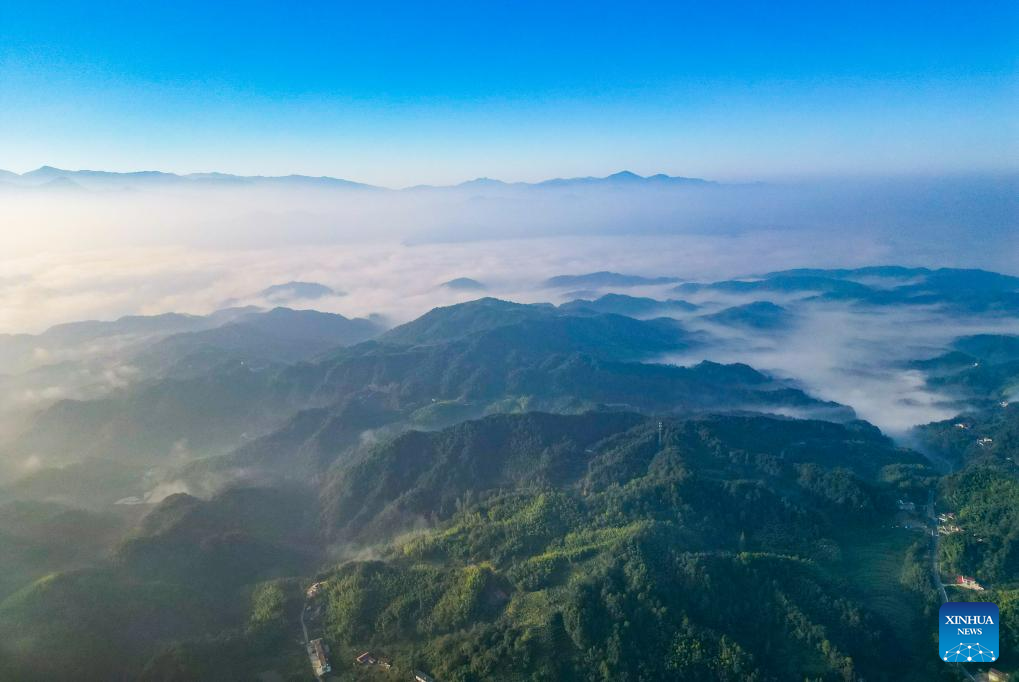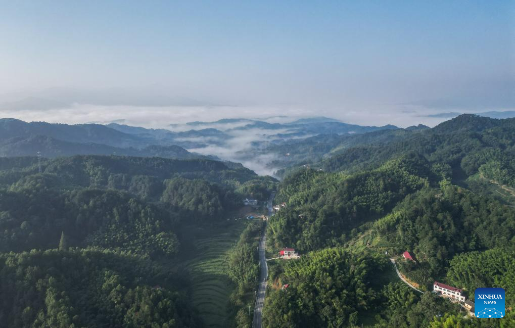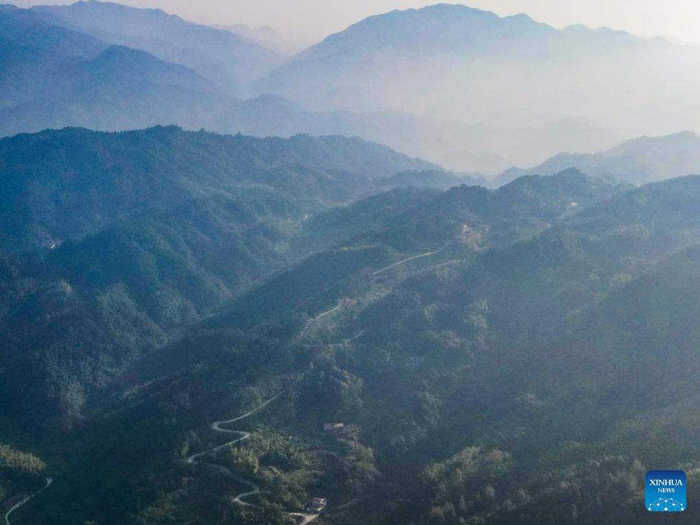 This aerial photo taken on Aug. 23, 2023 shows mountain scenery in Manshuihe Town of Lu'an City, east China's Anhui Province. (Xinhua/Guo Chen)