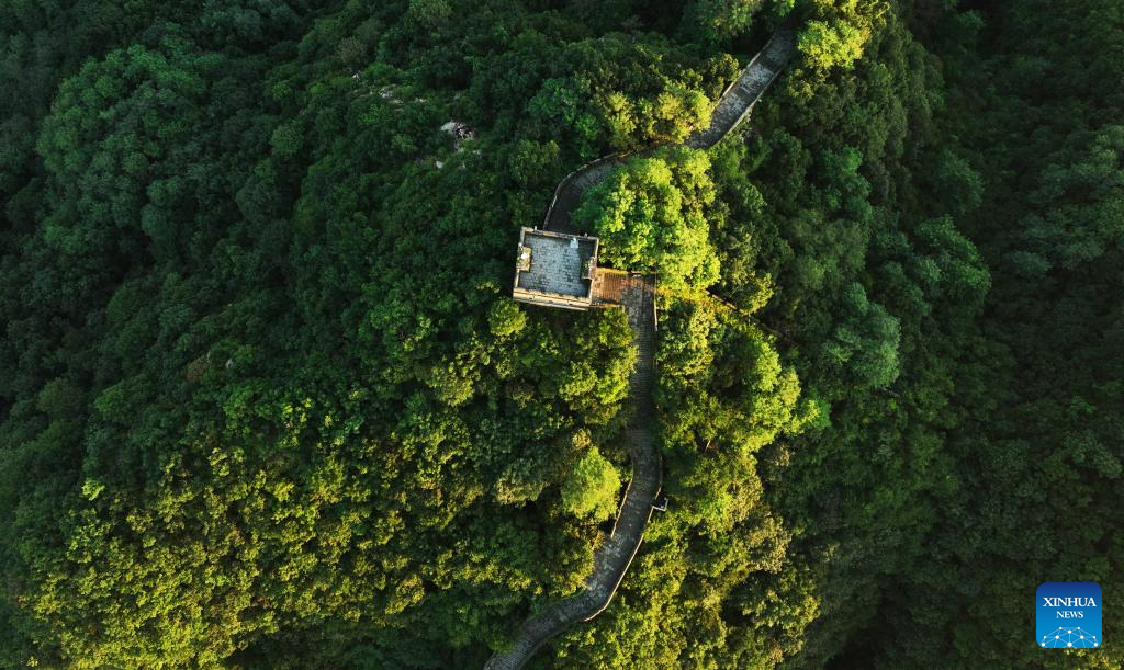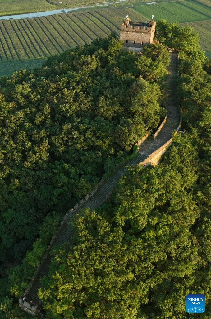 This aerial photo taken on Aug. 23, 2023 shows the scenery of Hushan section of the Great Wall in Dandong City, northeast China's Liaoning Province. (Xinhua/Yang Qing)