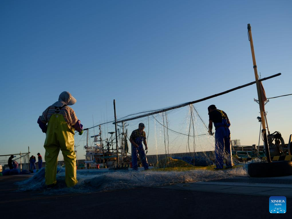 Fishermen dry fishing nets at Tsurishihama Fishing Port in Shinchi Town, Fukushima Prefecture, Japan, Aug. 23, 2023. (Xinhua/Zhang Xiaoyu)?