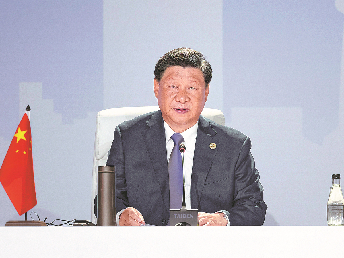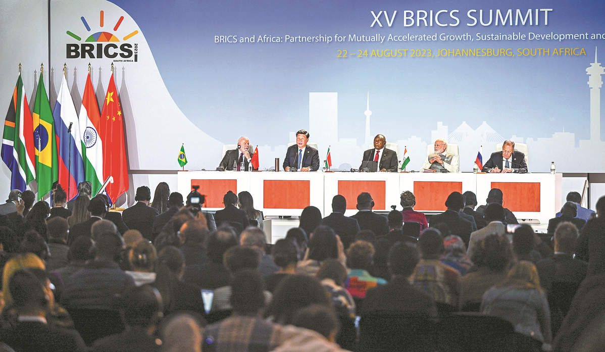 President Xi Jinping speaks at a special news conference on new membership of BRICS, during the 15th BRICS Summit in Johannesburg, South Africa, on Thursday. DING HAITAO/XINHUA