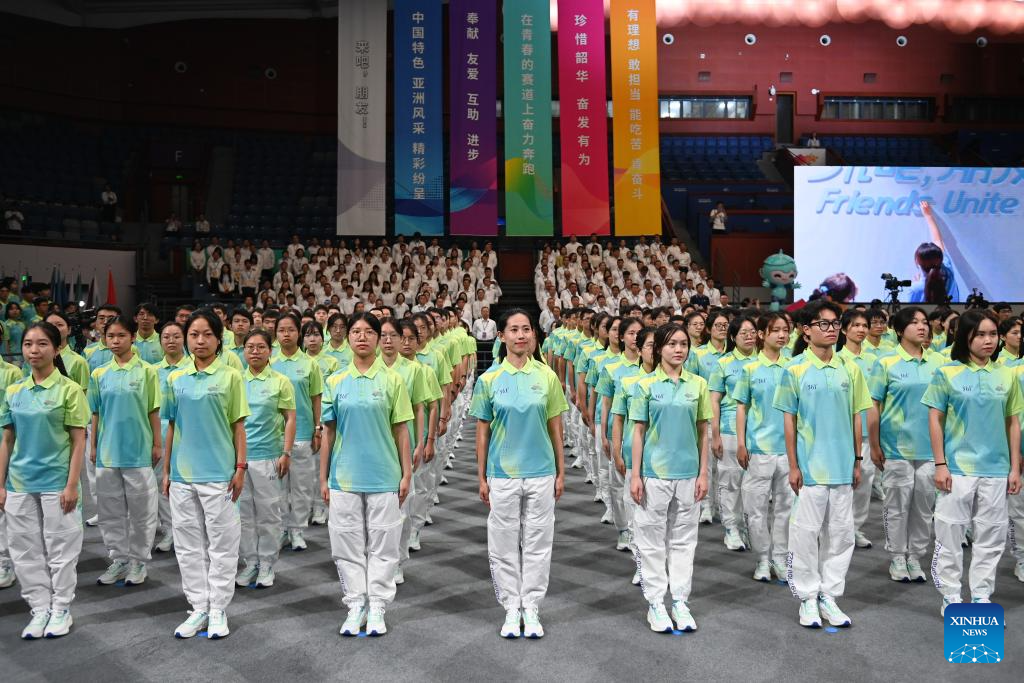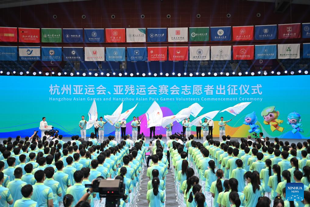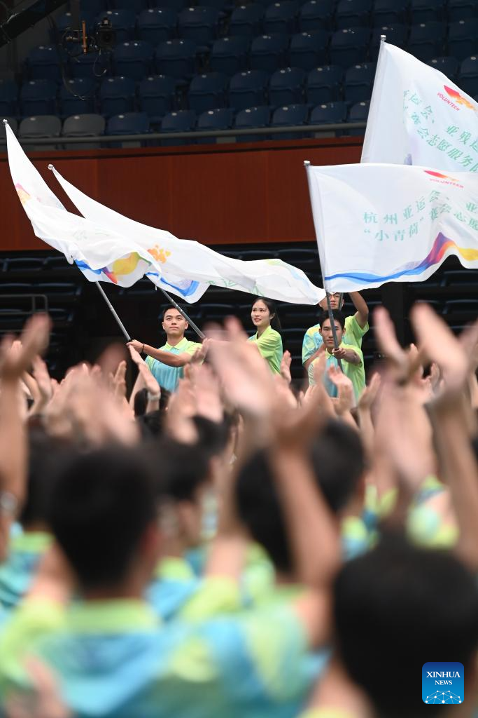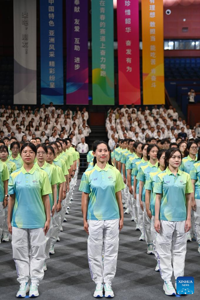 Volunteers are seen during the Hangzhou Asian Games and Hangzhou Asian Para Games Volunteers Commencement Ceremony in Hangzhou, capital of east China's Zhejiang Province, Aug. 24, 2023. (Xinhua/Huang Zongzhi)
