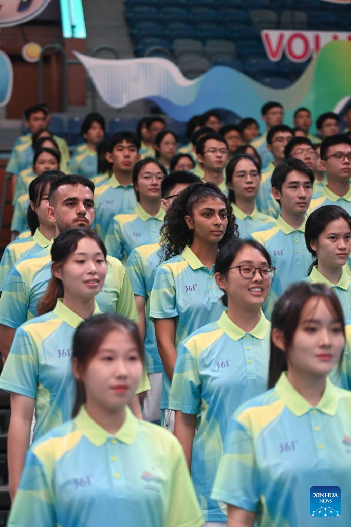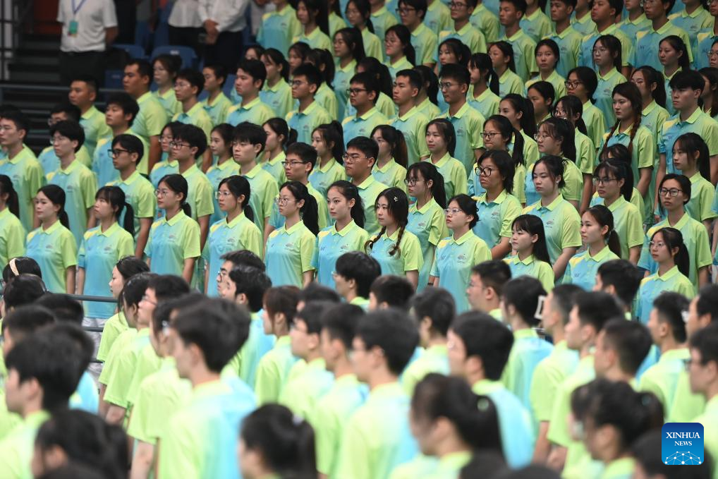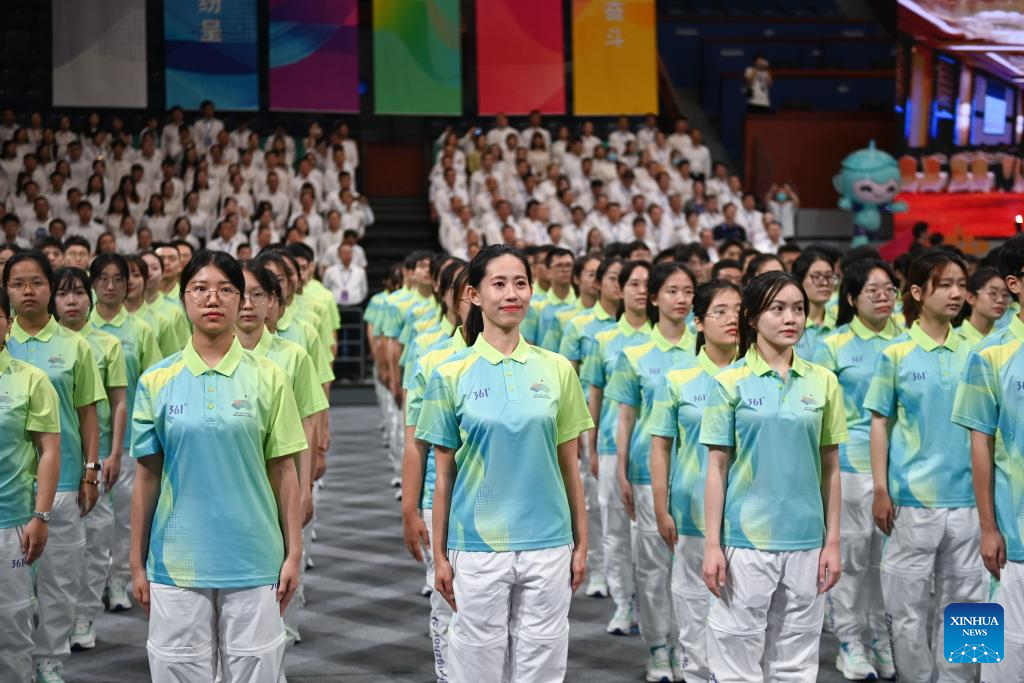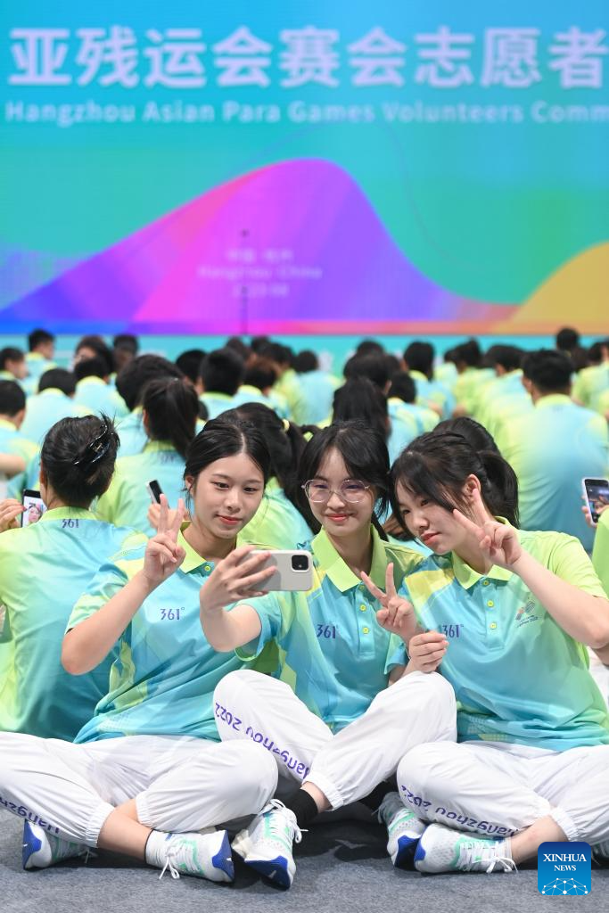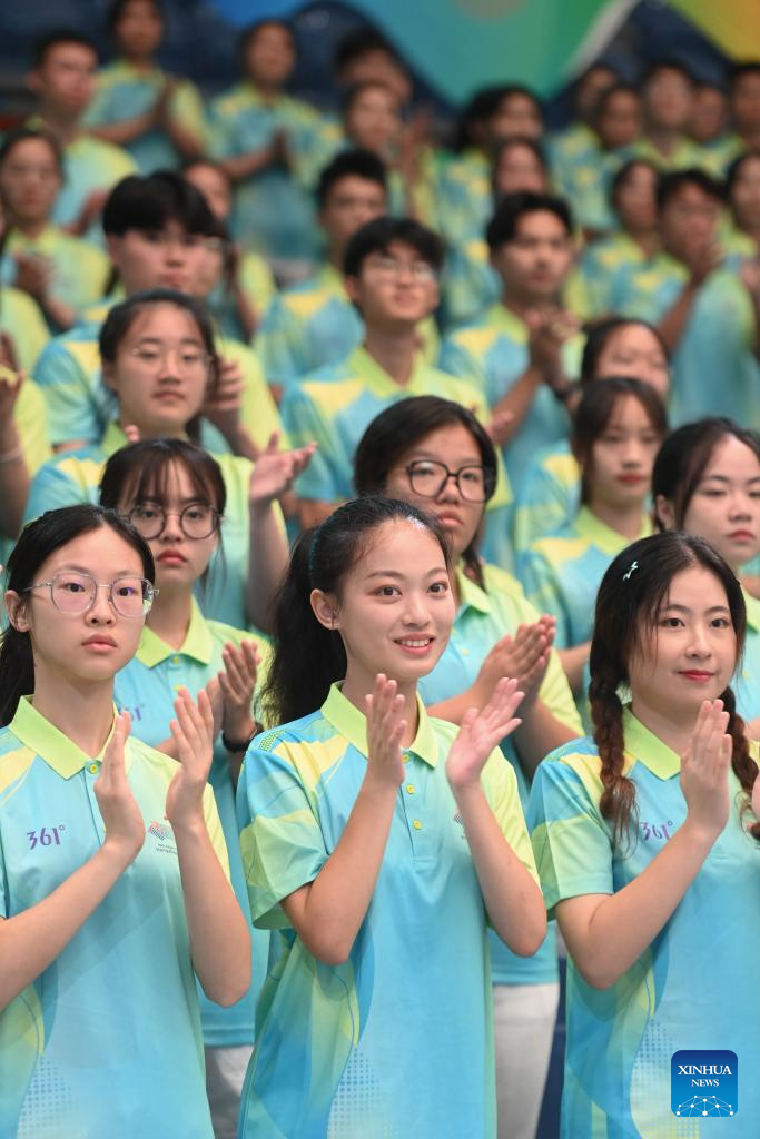 Volunteers are seen during the Hangzhou Asian Games and Hangzhou Asian Para Games Volunteers Commencement Ceremony in Hangzhou, capital of east China's Zhejiang Province, Aug. 24, 2023. (Xinhua/Huang Zongzhi)