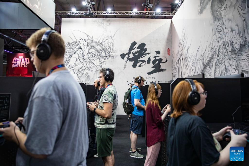 People try games at the booth of game science during gamescom 2023 in Cologne, Germany, Aug. 23, 2023. (Xinhua/Zhang Fan)