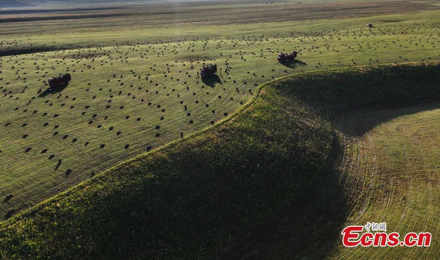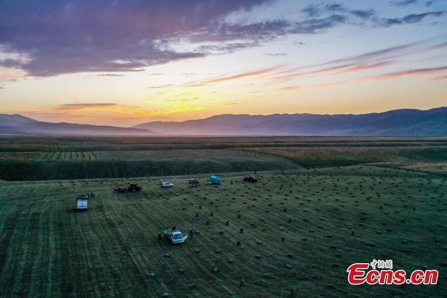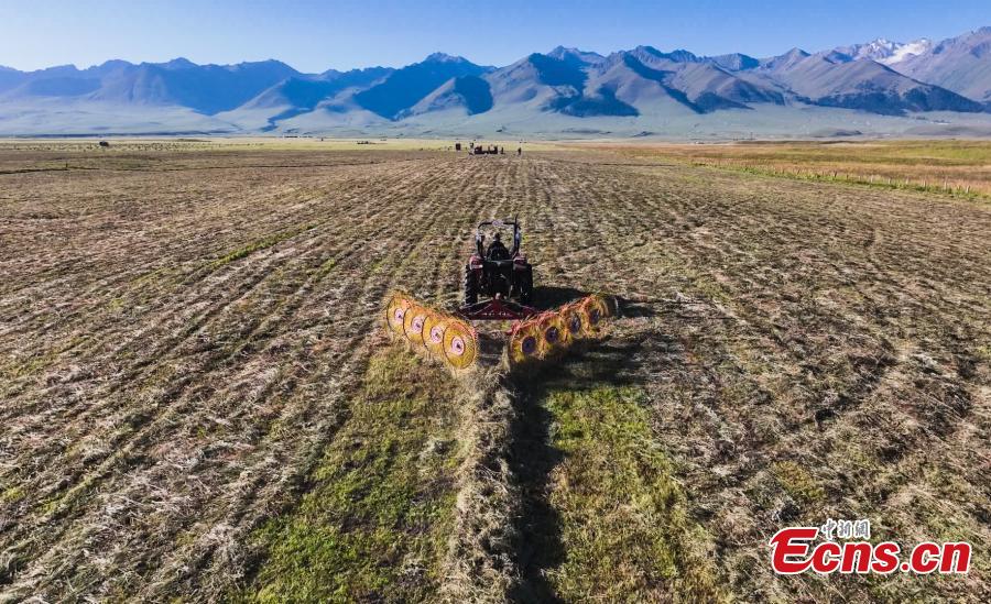 Machines harvest grasses on Nalati grassland in Xinjiang Uygur Autonomous Region. (Photo: China News Service/Zhang Wenting)