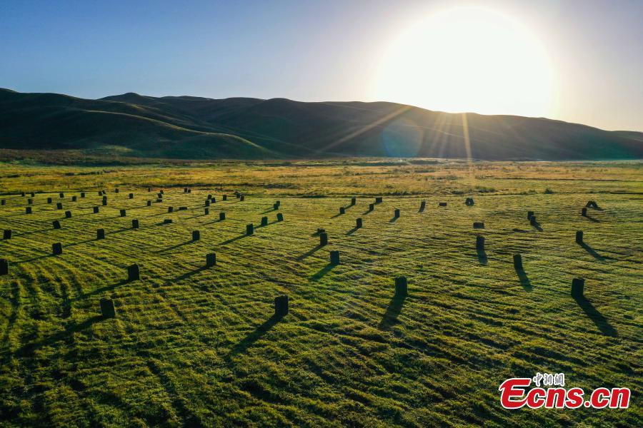 Harvested grasses are piled up on Nalati grassland in Xinjiang Uyghur Autonomous Region. (Photo: China News Service/Zhang Wenting)