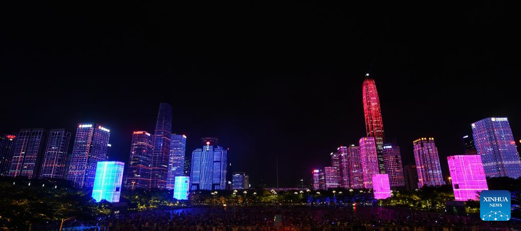 This photo taken on Aug. 25, 2023 shows a light show in Shenzhen, south China's Guangdong Province. A light show was held in Shenzhen on Friday to celebrate the 43rd anniversary of the establishment of the Shenzhen Special Economic Zone. (Xinhua/Liang Xu)