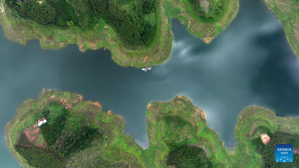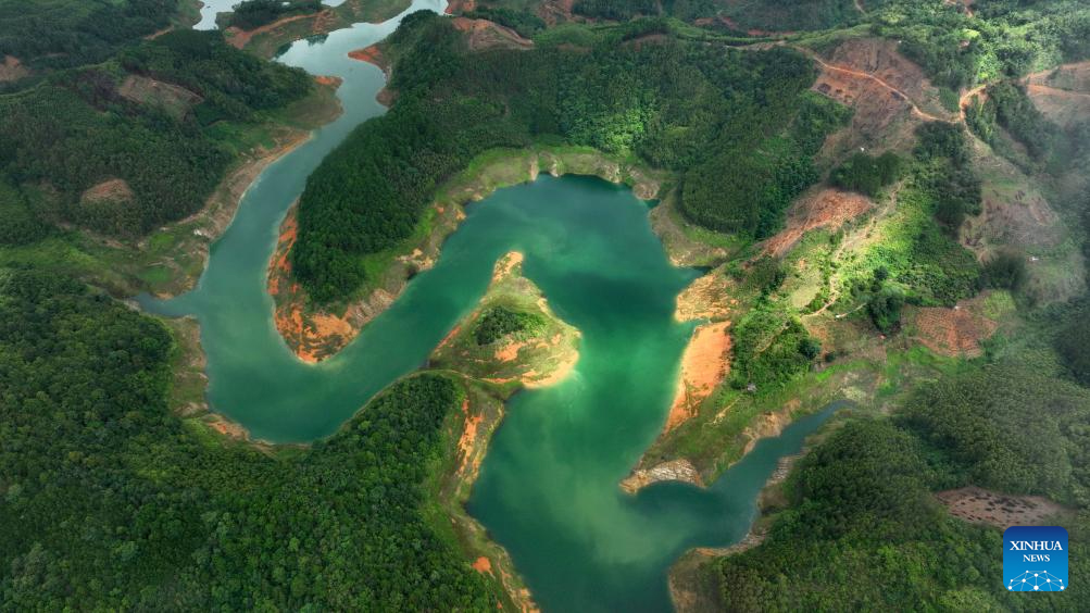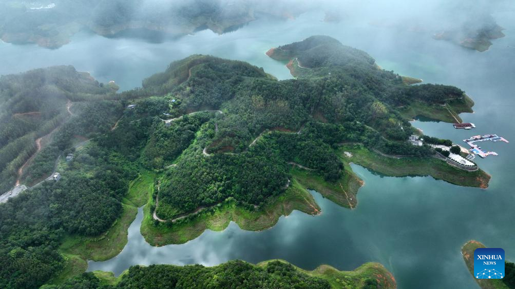 This aerial photo taken on Aug. 25, 2023 shows the scenery of Wanfeng Lake in Xingyi City of Qianxinan Buyi and Miao Autonomous Prefecture, southwest China's Guizhou Province. Qianxinan Buyi and Miao Autonomous Prefecture in Guizhou is rich in ecotourism resources and the local government has been promoting its tourism industry in recent years for better rural development. (Xinhua/Yang Ying)