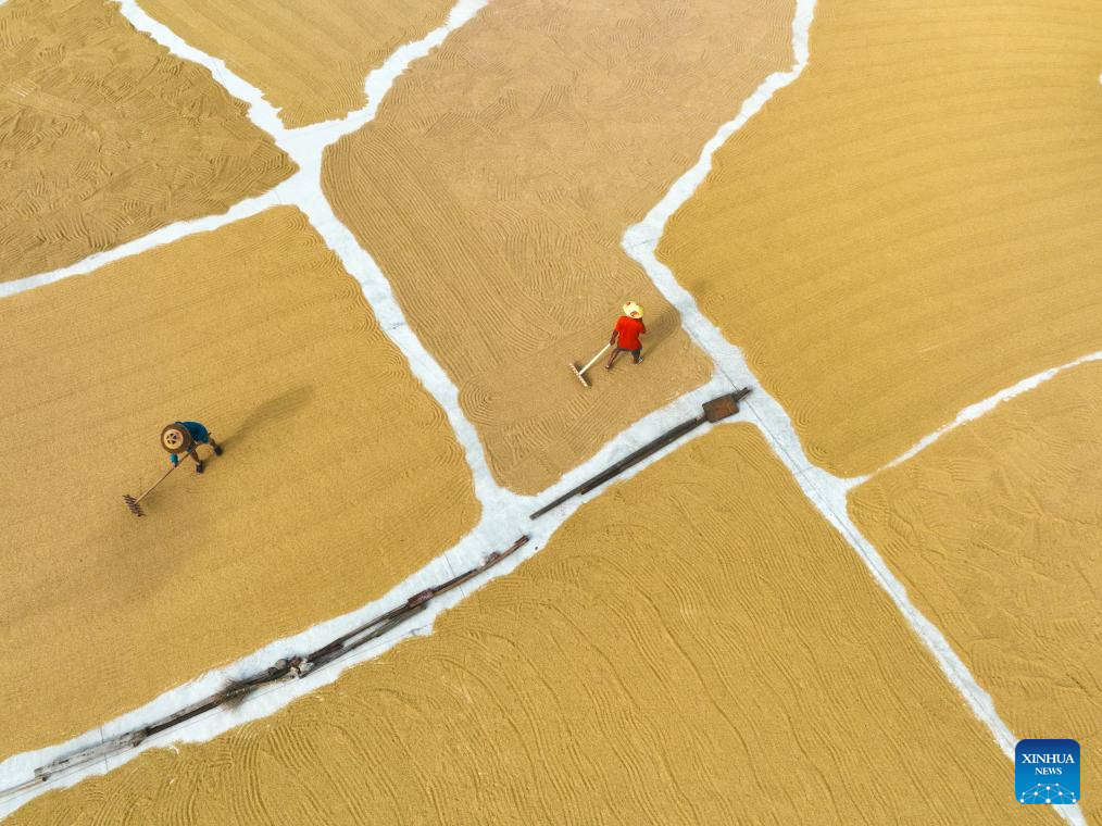This aerial photo taken on Aug. 26, 2023 shows villagers airing rice at Quanjing Village of Hengyang City, central China's Hunan Province. (Photo by Zhou Xiuyuchun/Xinhua)