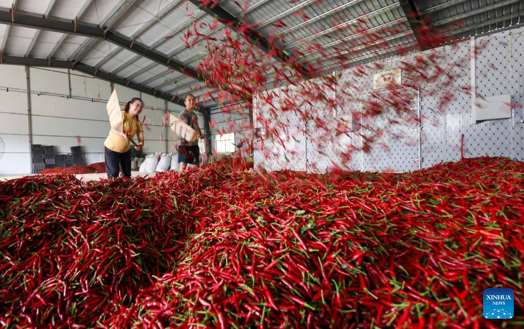 Villagers arrange newly-harvested red chilies at Dashulin Village of Cengong County in southwest China's Guizhou Province, Aug. 26, 2023. (Photo by Hu Panxue/Xinhua)