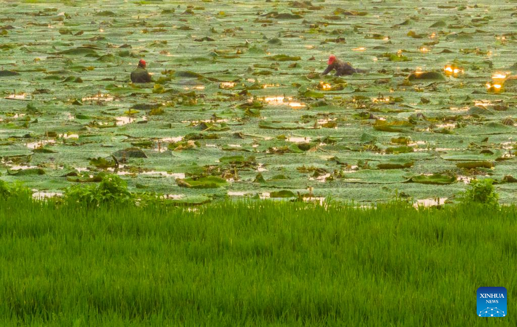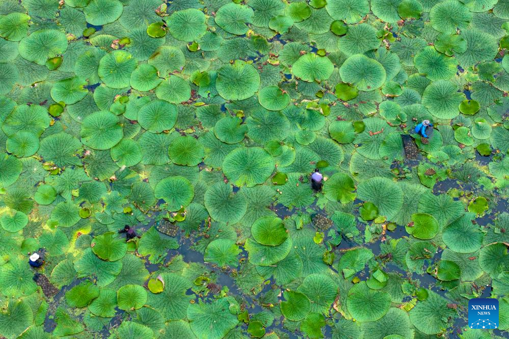 This aerial photo taken on Aug. 26, 2023 shows farmers harvesting gorgon fruit at Shenyu Village of Taizhou City, east China's Jiangsu Province. (Photo by Yan Yuming/Xinhua)