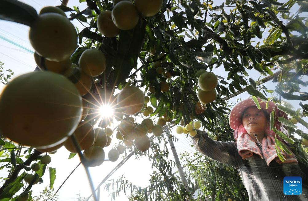 A villager harvests winter jujubes at Yonghe Village of Hengyang City, central China's Hunan Province, Aug. 26, 2023. (Photo by Cao Zhengping/Xinhua)