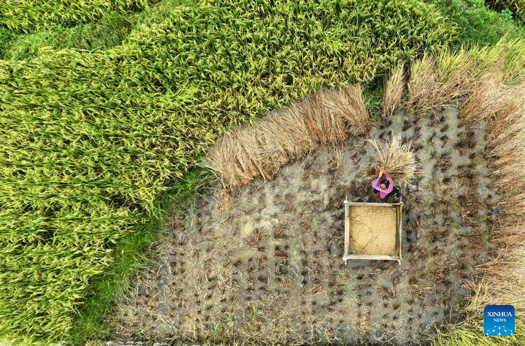 This aerial photo taken on Aug. 25, 2023 shows villagers harvesting paddy rice at Xiama Village of Chenzhou City, central China's Hunan Province. (Photo by Zhou Xiuyuchun/Xinhua)