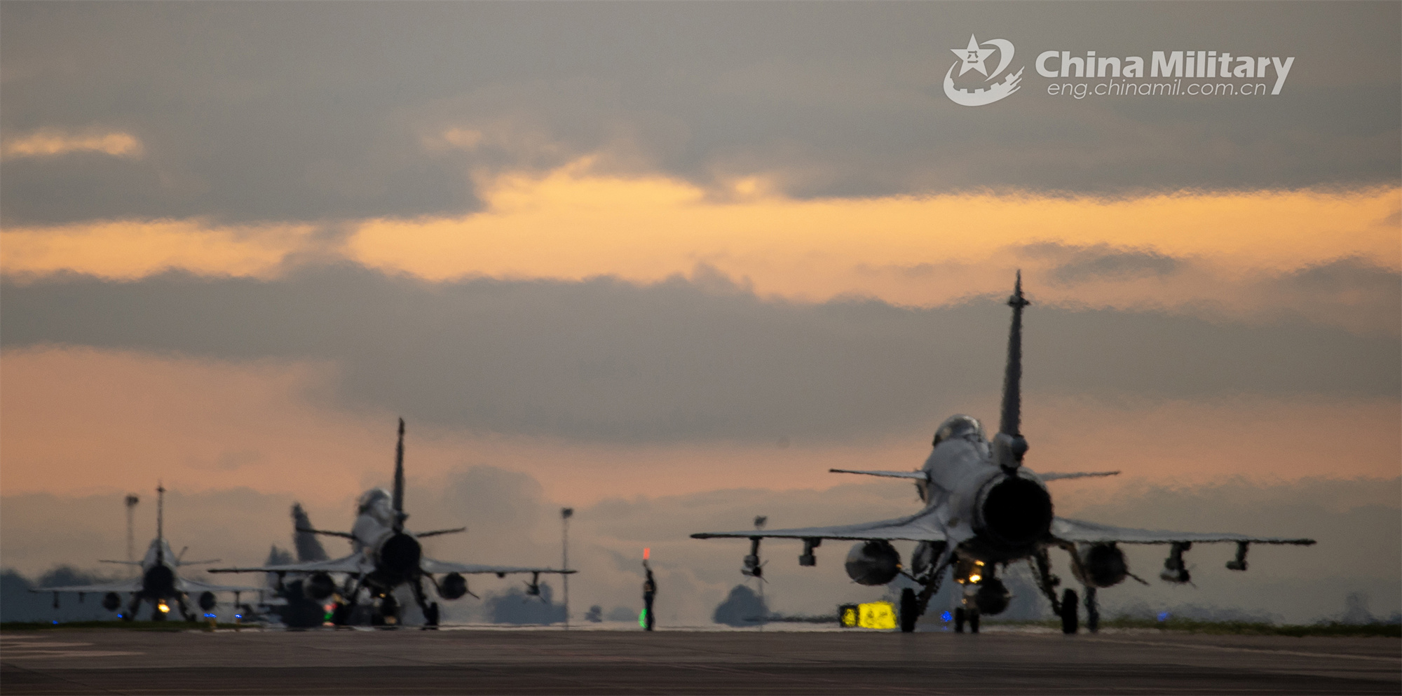 J-10 fighter jets attached to an aviation brigade of the air force under the PLA Southern Theater Command taxi on the runway in formation during a flight training exercise on August 15, 2023. (eng.chinamil.com.cn/Photo by Wang Guoyun)