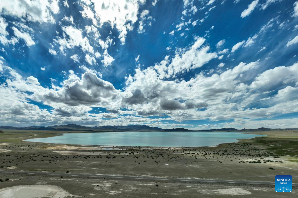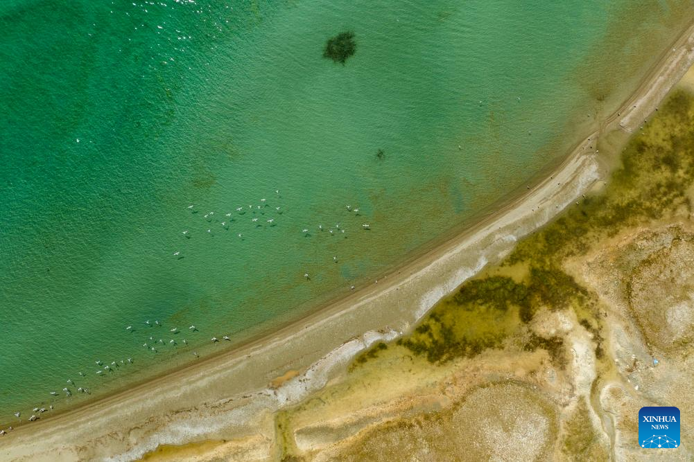 This aerial photo taken on Aug. 25, 2023 shows the scenery of a lake at Ge'gyai County of Ngari Prefecture, in southwest China's Tibet Autonomous Region. (Photo by Tenzin Norbu/Xinhua)