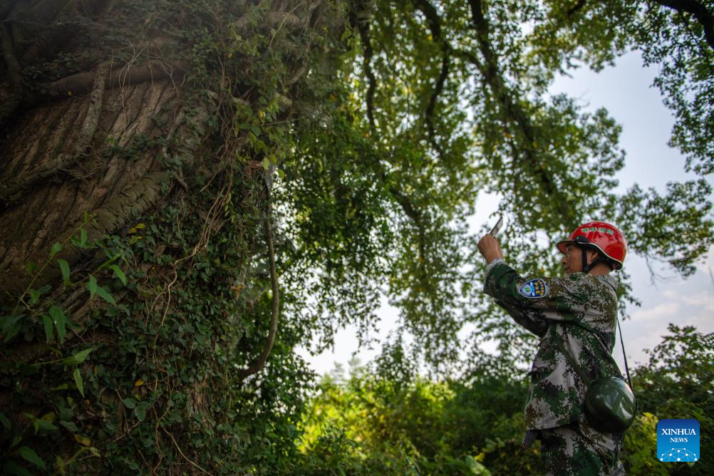 Huang Weigu monitors the growth of an ancient tree in Pingwan Village of Jingang Town, Liuyang City of central China's Hunan Province, Aug. 24, 2023. (Xinhua/Chen Sihan)
