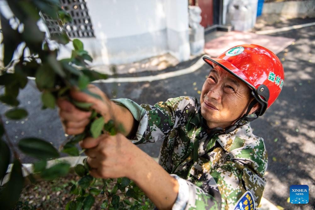 Huang Weigu cleans vines on an ancient tree in Dangui Village of Jingang Town, Liuyang City of central China's Hunan Province, Aug. 24, 2023. (Xinhua/Chen Sihan)
