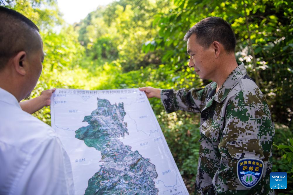 Huang Weigu patrols on a mountain in Pingwan Village of Jingang Town, Liuyang City of central China's Hunan Province, Aug. 24, 2023. (Xinhua/Chen Sihan)