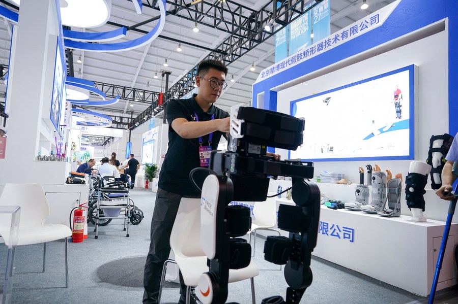 An exhibitor presents a walking aid product at the seventh China-South Asia Expo in Kunming, southwest China's Yunnan Province, Aug. 16, 2023. (Xinhua/Chen Xinbo)