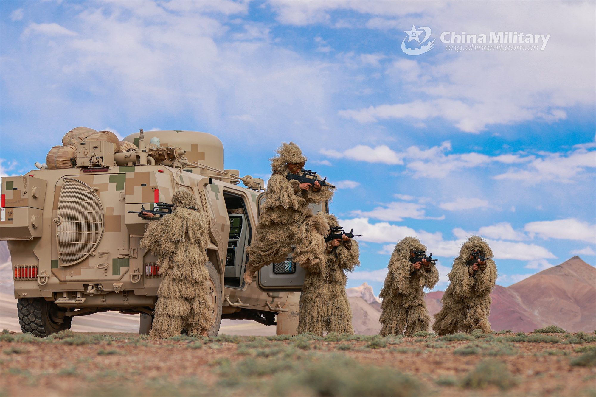 Soldiers assigned to an army regiment charge at simulated targets in ghillie suits and provide cover for each other during a live-fire exercise on August 12, 2023. (eng.chinamil.com.cn/Photo by Li Longfei)