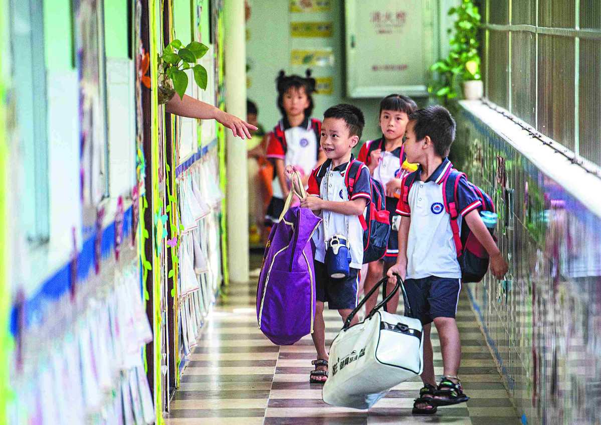 With luggage in hand, children enter a kindergarten in Qionghai, Hainan province, on Monday. Some parents accompanied their children in the kindergarten to help them get comfortable with the new environment. MENG ZHONGDE/FOR CHINA DAILY