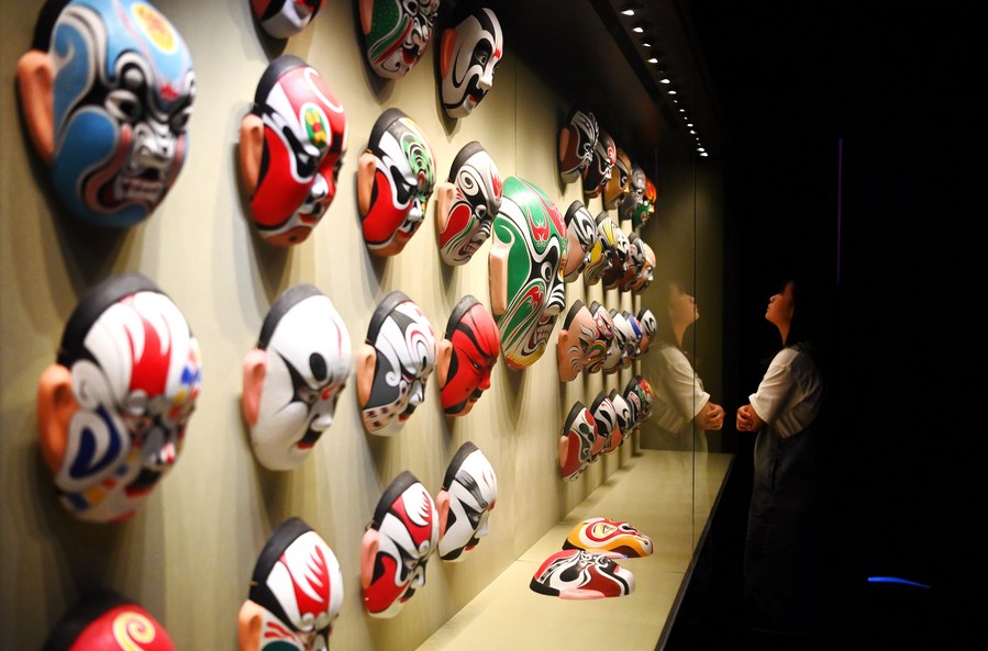 A tourist visits an exhibition at a Qinqiang opera art museum in the Yisushe Theater cultural block in Xi'an, capital of northwest China's Shaanxi Province, Aug. 8, 2023. (Xinhua/Liu Xiao)