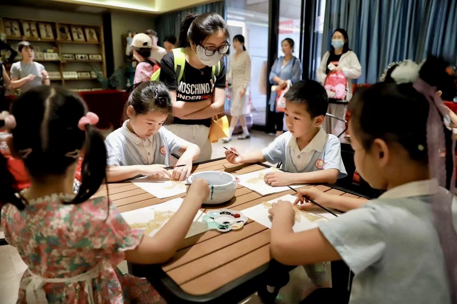 Children learn Qinqiang Opera at the Yisushe Theater cultural block in Xi'an City, capital of northwest China's Shaanxi Province, Aug. 6, 2023. (Xinhua)