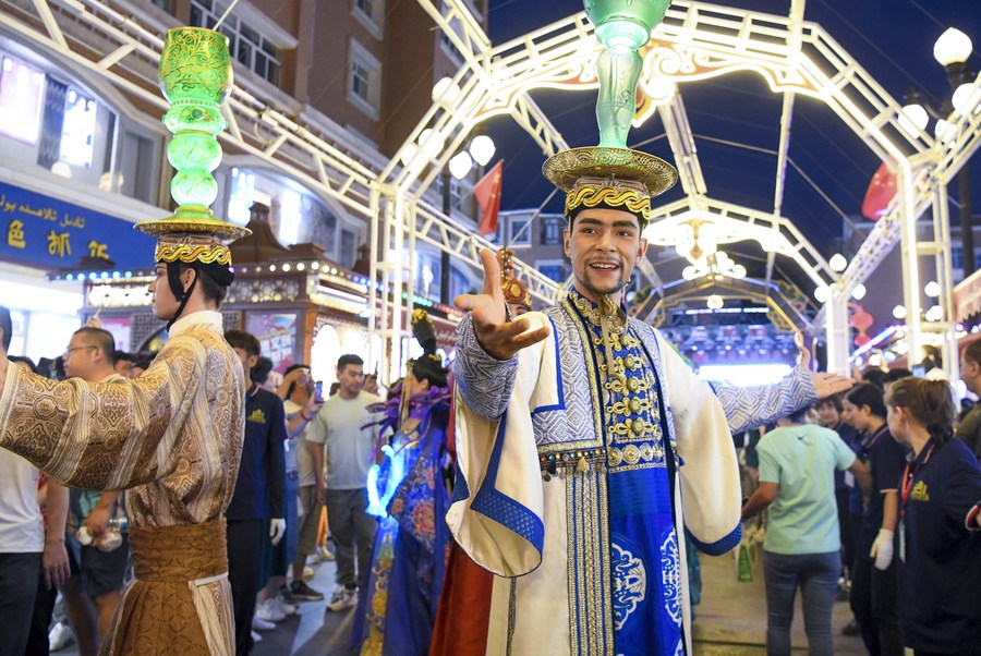 Actors perform at the Xinjiang International Grand Bazaar in Urumqi, northwest China's Xinjiang Uygur Autonomous Region, Aug. 28, 2023. (Xinhua/Wang Fei)