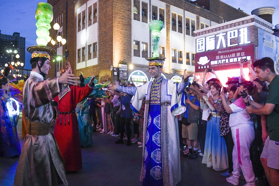 A performance is staged at the Xinjiang International Grand Bazaar in Urumqi, northwest China's Xinjiang Uygur Autonomous Region, Aug. 1, 2023. (Xinhua/Wang Fei)