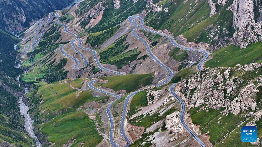 This aerial photo taken on Aug. 22, 2023 shows the view along Duku Highway in northwest China's Xinjiang Uygur Autonomous Region. The Duku Highway, deemed one of China's most beautiful roads, is a scenic mountainous section spanning over 500 kilometers between Dushanzi and Kuqa on China's National Highway 217 in Xinjiang. A major road linking northern and southern Xinjiang, Duku Highway is also famous for its spectacular natural landscape including glaciers, forests, and grasslands. (Xinhua/Wang Peng)