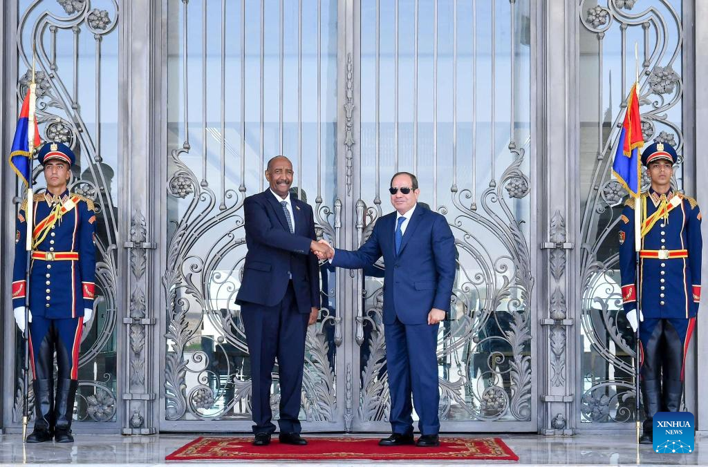 Egyptian President Abdel-Fattah al-Sisi (R) shakes hands with visiting Chairman of Sudan's Sovereign Council Abdel Fattah Al-Burhan, also the general commander of the Sudanese Armed Forces, in New Alamein, Egypt, Aug. 29, 2023. Egyptian President Abdel-Fattah al-Sisi and visiting Chairman of Sudan's Sovereign Council Abdel Fattah Al-Burhan on Tuesday discussed bilateral ties and the latest developments in the Sudanese crisis. (Egyptian Presidency/Handout via Xinhua)