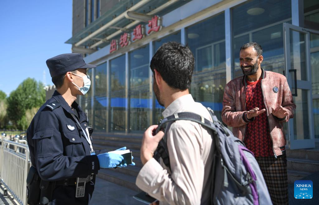A policeman talks with travelers from Pakistan at the Kunjirap Pass in Taxkorgan Tajik Autonomous County, northwest China's Xinjiang Uygur Autonomous Region, Aug. 29, 2023. After it resumed passenger customs clearance on April 3, the Kunjirap Pass has recorded over 21,000 inbound and outbound passengers. (Xinhua/Hu Huhu)