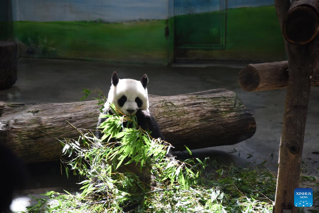 Giant panda Yuan Yuan eats bamboo at Taipei Zoo in Taipei, southeast China's Taiwan, Aug. 30, 2023. (Xinhua/Wang Chenghao)