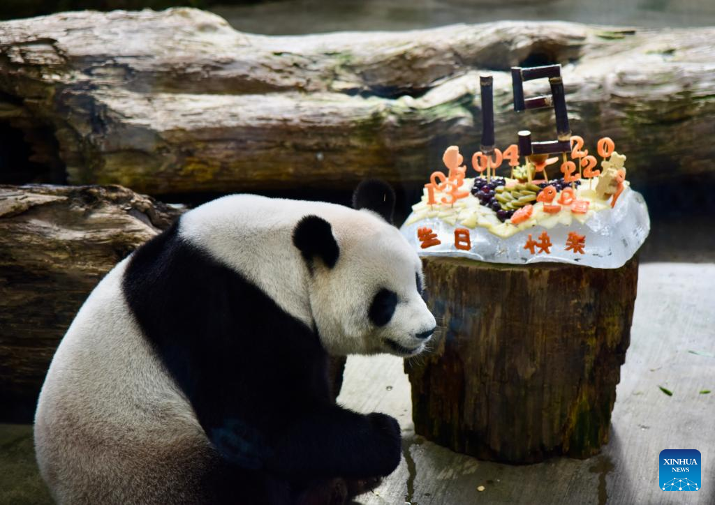 Giant panda Yuan Yuan enjoys a birthday meal at Taipei Zoo in Taipei, southeast China's Taiwan, Aug. 30, 2023. (Xinhua/Wang Chenghao)
