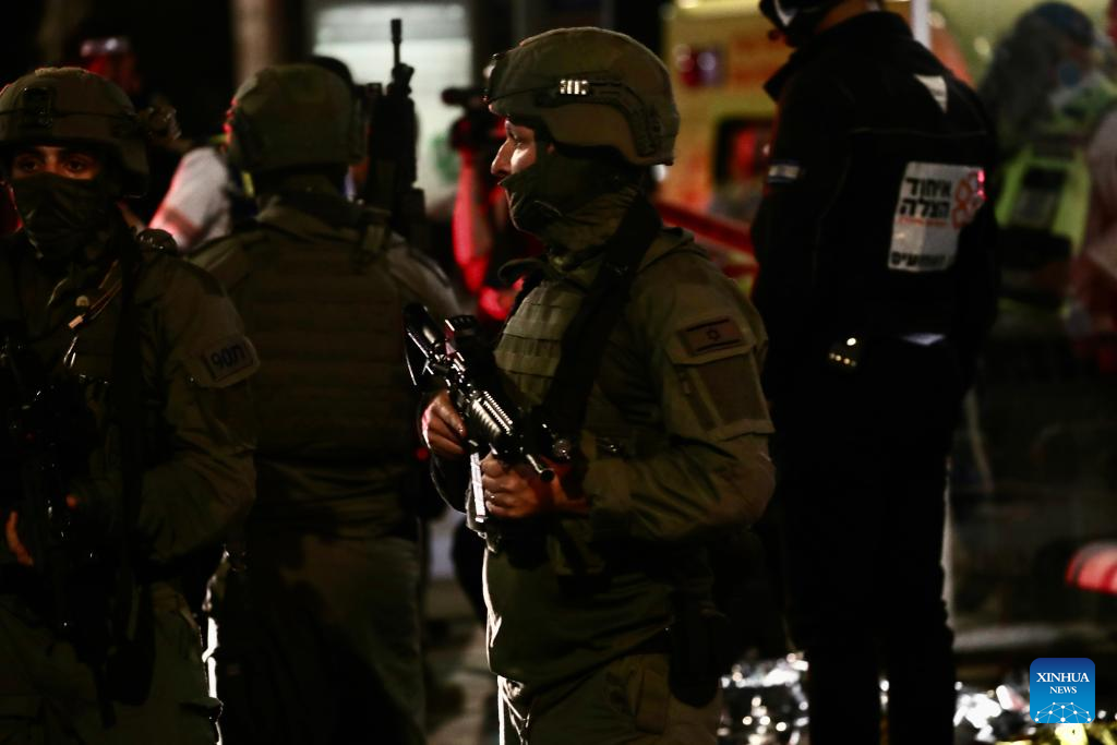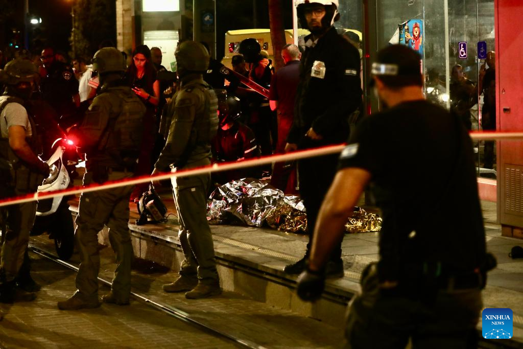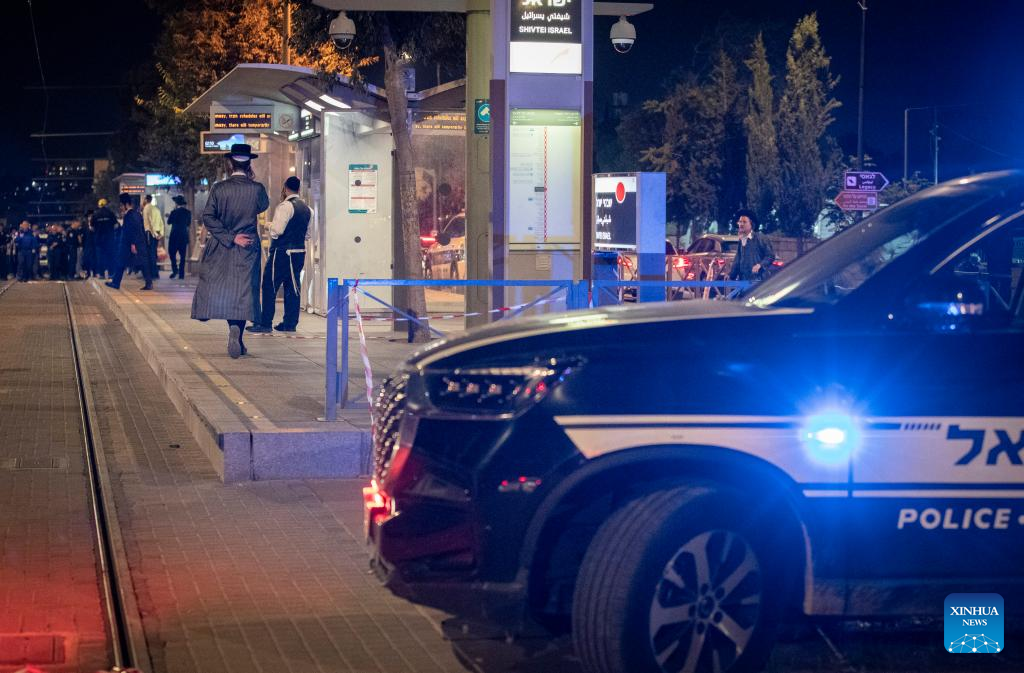 Israeli security forces work at the site of a knife attack at a light rail stop near East Jerusalem, on Aug. 30, 2023. A Palestinian dressed as an ultra-Orthodox Jew stabbed an Israeli in Jerusalem on Wednesday before being shot and killed by the Israeli police. (Xinhua/Chen Junqing)