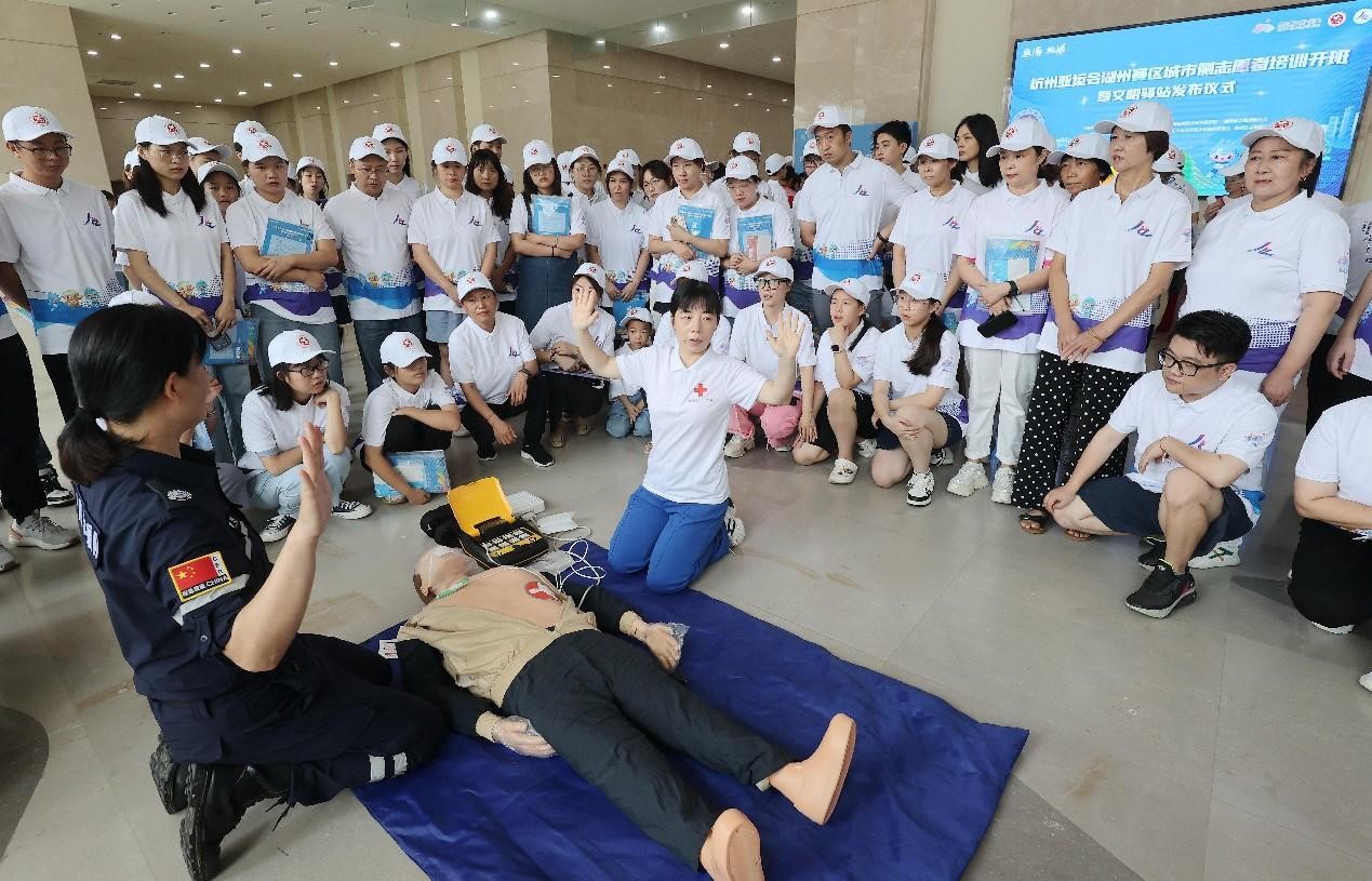 Medical experts instruct volunteers for the Hangzhou Asian Games to perform cardiopulmonary resuscitation on the Moganshan Campus of Zhejiang University of Technology, Aug. 23, 2023. (People's Daily Online/Xie Shangguo)