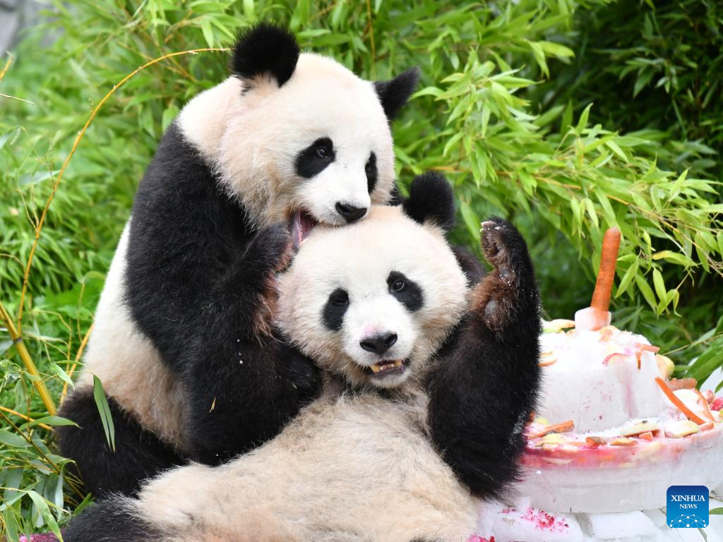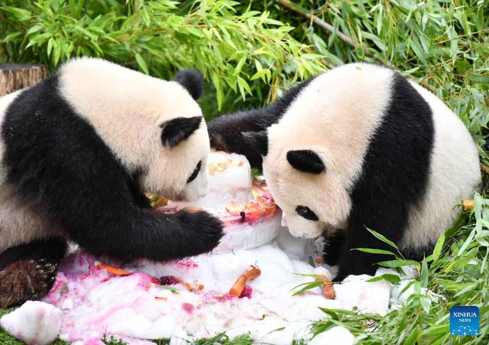 Giant pandas Meng Xiang (L) and Meng Yuan enjoy a "birthday cake" at Zoo Berlin in Berlin, capital of Germany, Aug. 31, 2023. The pair of giant pandas celebrated their fourth birthday in Zoo Berlin on Thursday. (Xinhua/Ren Pengfei)