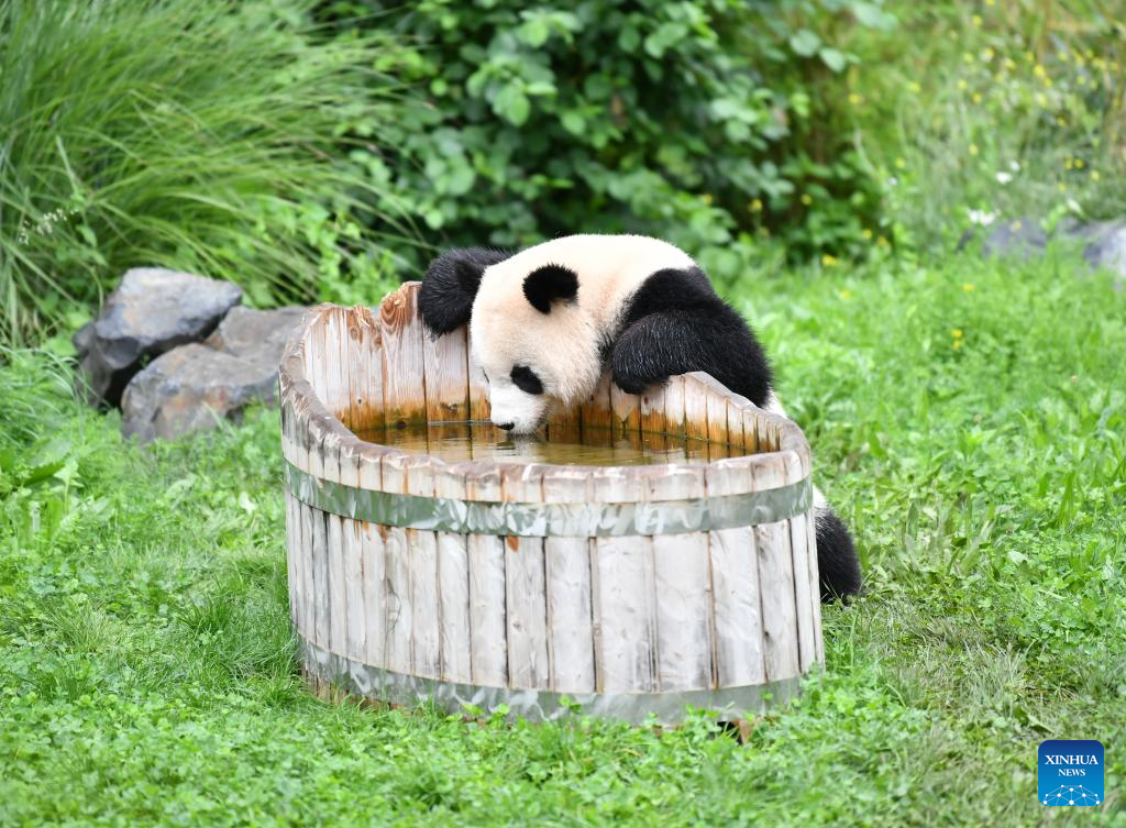 Giant panda Meng Yuan is seen at Zoo Berlin in Berlin, capital of Germany, Aug. 31, 2023. The pair of giant pandas celebrated their fourth birthday in Zoo Berlin on Thursday. (Xinhua/Ren Pengfei)