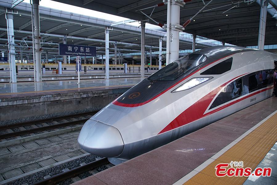 A Fuxing bullet train G4308 departs Nanning, capital of South China's Guangxi Zhuang Autonomous Region, for Guiyang, capital of Guizhou Province, on Aug 31, 2023. (Photo/China News Service)