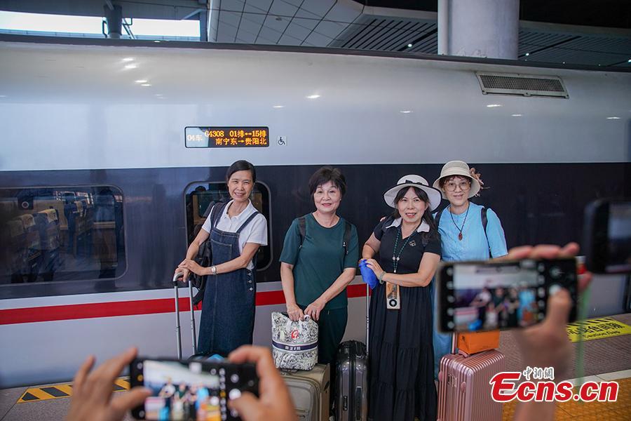 Passengers pose for a photo before Fuxing bullet train G4308 departs Nanning, capital of South China's Guangxi Zhuang Autonomous Region, for Guiyang, capital of Guizhou Province, on Aug 31, 2023. (Photo/China News Service)