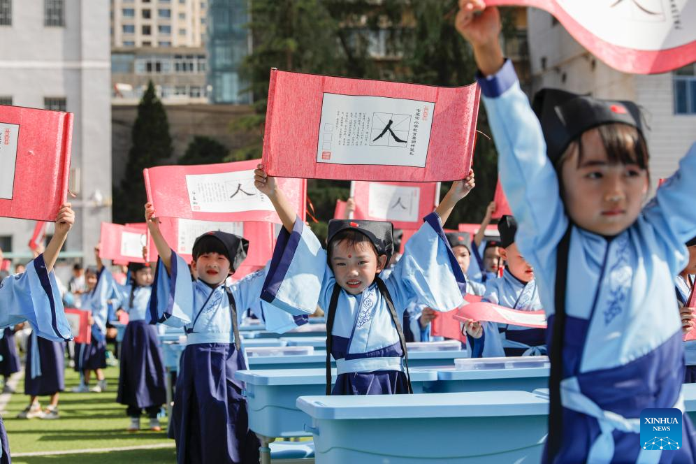 Students display calligraphy works featuring the Chinese character "ren" (meaning "person" or "human") at a primary school in Hefei, east China's Anhui Province, Sept. 1, 2023. The new school semester kicked off in many parts of China on Friday. (Xinhua/Zhou Mu)